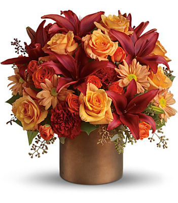 Autumn is an awesome season and it's meant to be celebrated in style. Rich fall hues are on brilliant display in this beautiful arrangement that comes delivered in an elegant satiny brown cylinder vase.