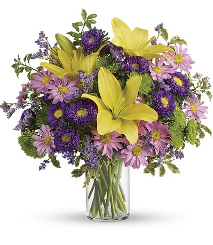 Sprinkle happiness on any occasion with this bright, beautiful bouquet! A cheerful blend of sunshiny lilies, pretty purple blooms and glowing greens in a classic cylinder, it makes any day feel fresh and fabulous!